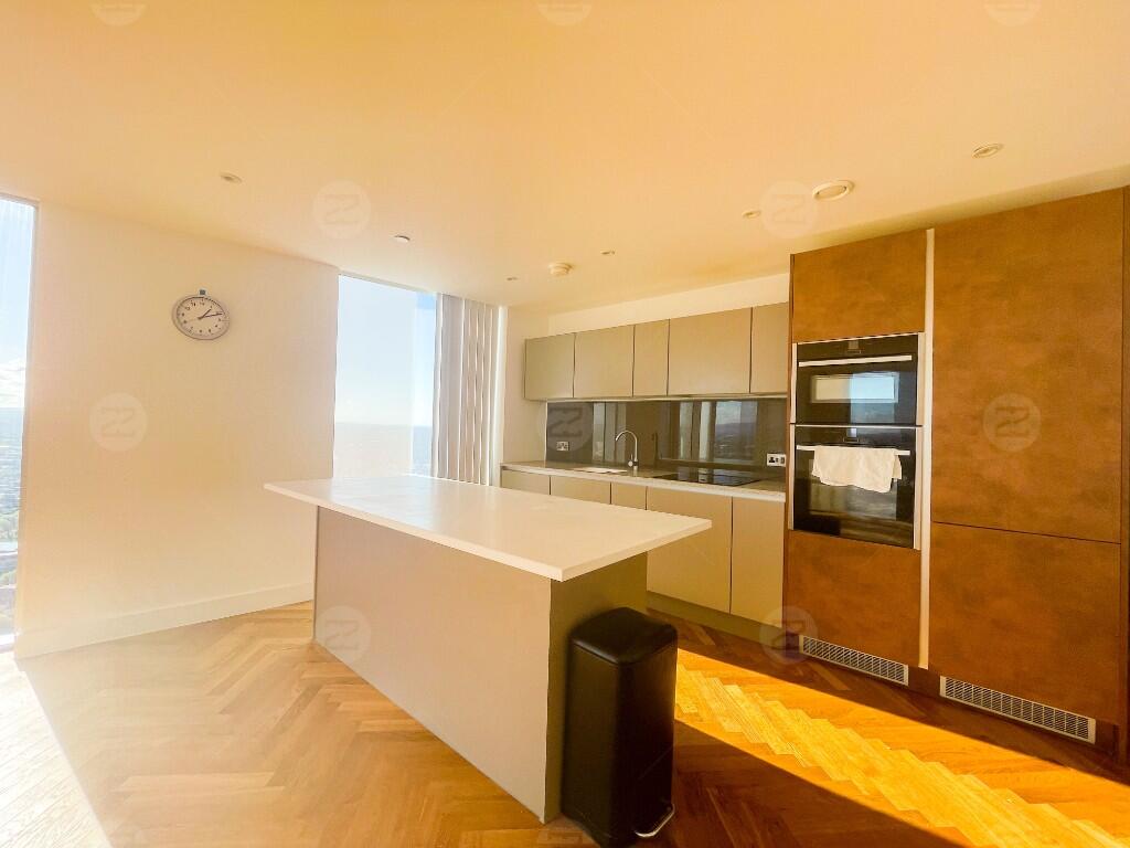 The apartment features a bright and spacious open-plan living area with floor-to-ceiling windows, showcasing spectacular panoramic views across Manchester. The modern kitchen comes fully equipped with high-quality integrated appliances, perfect for contemporary living.