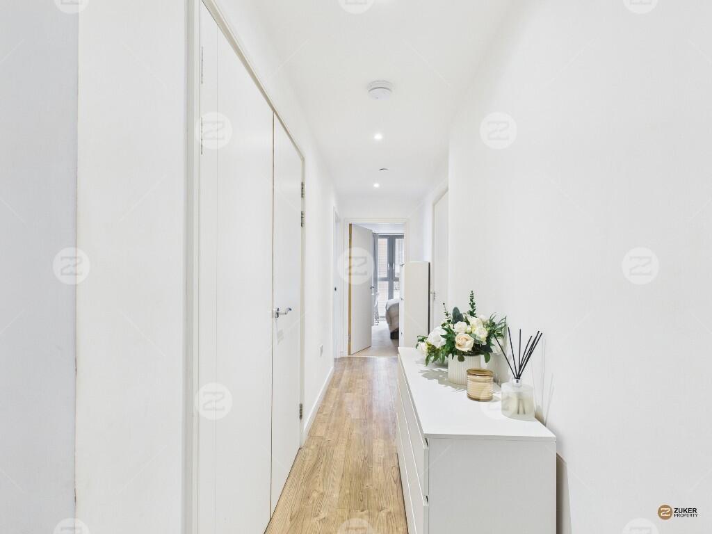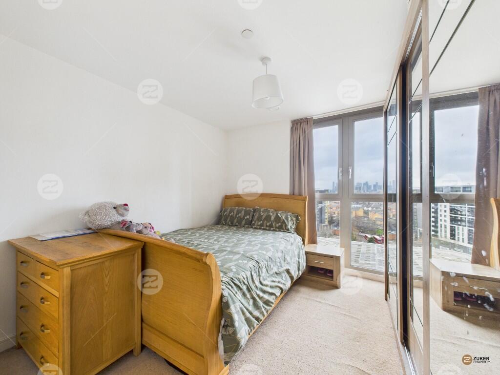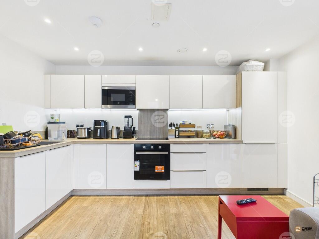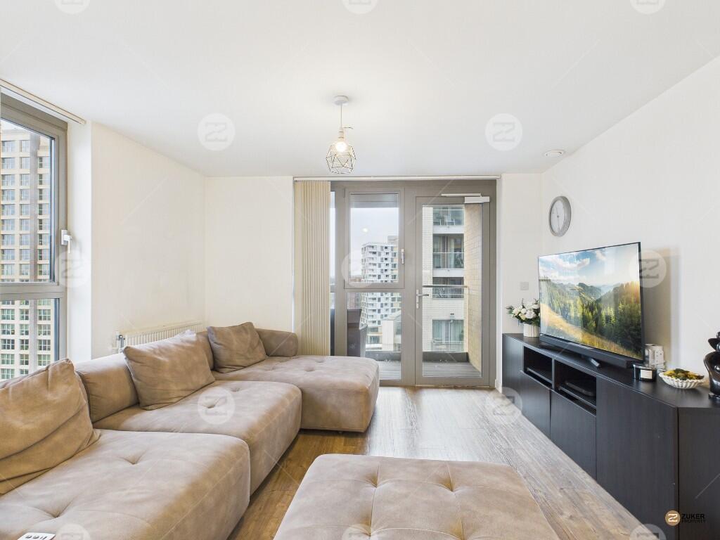 The apartment features a spacious living area with floor-to-ceiling windows, allowing for excellent natural light, alongside a modern open-plan kitchen fully equipped with integrated appliances. There are two well-proportioned double bedrooms and a contemporary bathroom. Further benefits include a private balcony and a 24-hour concierge service.