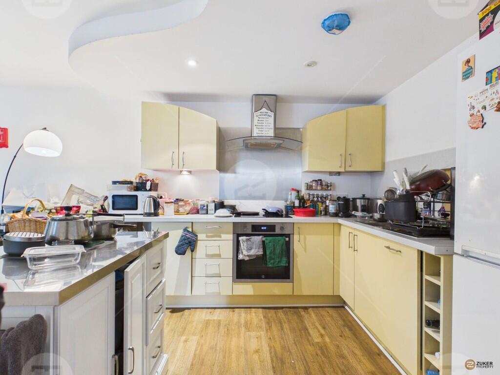 The property features a spacious open-plan living area with a fully equipped kitchen, complete with a highly practical kitchen island, perfect for both everyday living and entertaining. Situated on the 4th floor, the apartment enjoys a north-east facing aspect and benefits from a private balcony overlooking a peaceful internal courtyard garden.